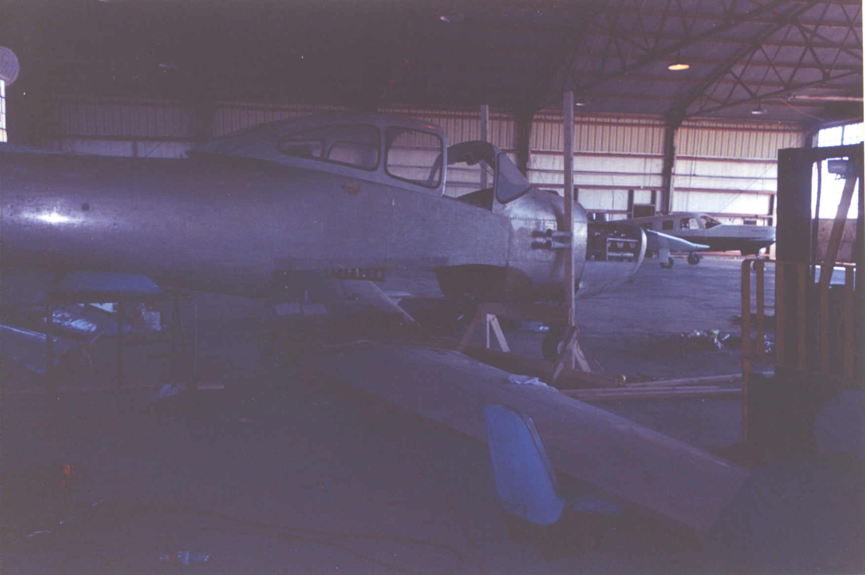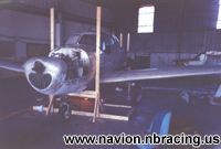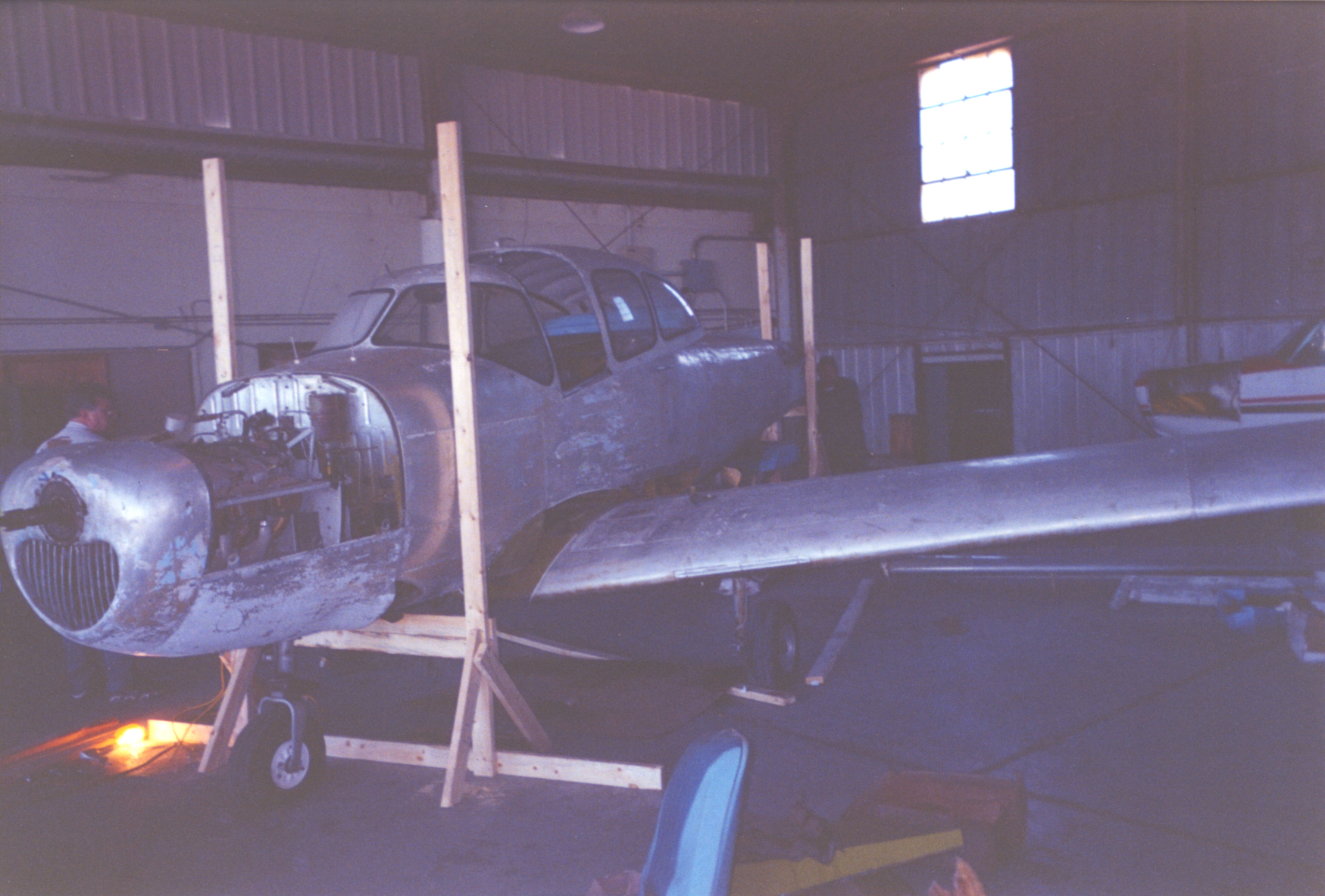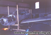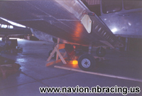 After removing the interior, wing fillets, belly panel, empennage, propellor, and the upper cowl, we used two-by-four's to construct front and rear stands to support the weight of the fuselage with engine. Take notice that the stands were built to hold the aircraft with the main gear up on 2x4's so that we could collapse the gear without raising the fuselage. Also note that another 2x4 was cut to brace the main wheels so they wouldn't collapse before we were ready! |