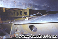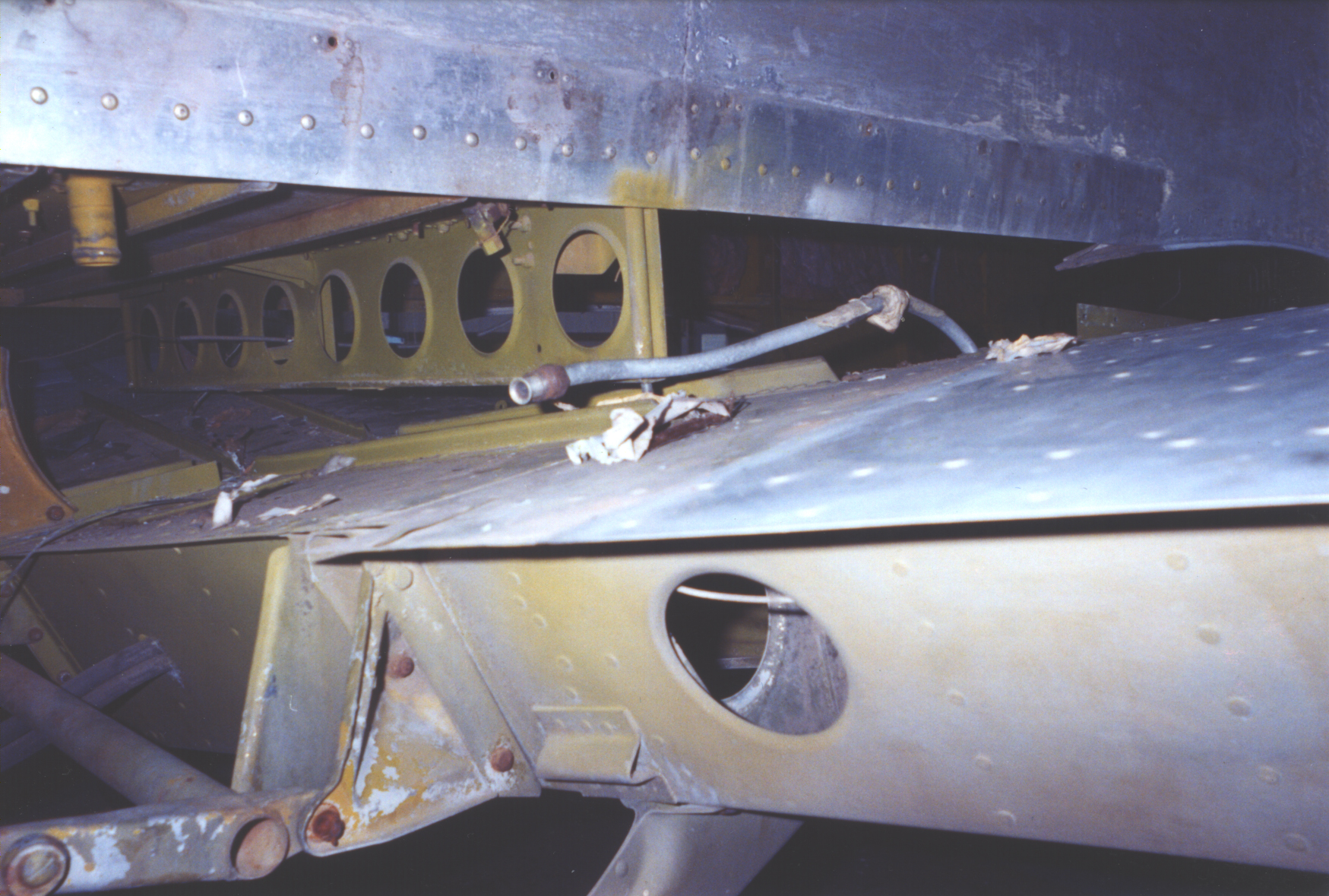 One of the annoying things to me before we went on this trip was that I couldn't get a clear picture of where the 6 attachment bolts for the wing were located. In the upper picture, you can see me up in the main gear well accessing the front lower attachment bolts. In the lower picture, you can see the shaft of one of the two rear bolts peeking below the aux. tank fuel tube. In a later picture of the removed wing, You'll clearly see the nut plates for all four of the front attachment bolts. |
