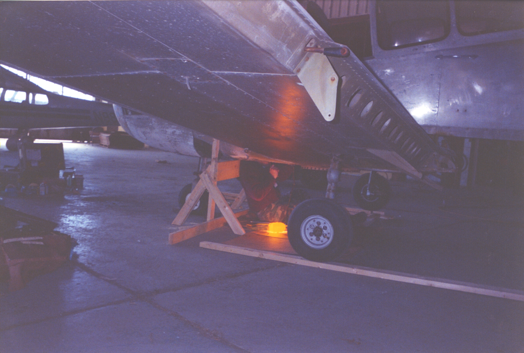 After all of the control cables, fuel lines, hydraulic lines, and electrical connections were undone (and those everpresent stragglers caught) and the six bolts removed, we held the wingtips one at a time and removed the 2x4's under the main wheels to lower the wing a bit (top picture). Then, we again grabbed each tip, collapsed it's gear and lowered the wing onto a mechanic's creeper and wheeled it out from under the fuselage. |