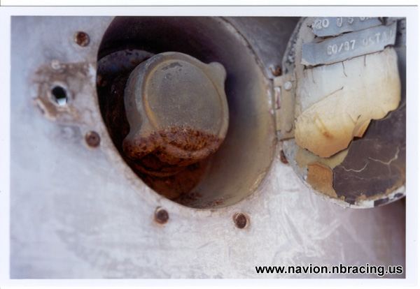 Here's the ugliest single bit of corrosion on the whole aircraft. It appears that the drain for the Auxiliary Fuel Filler is either clogged or nonexistent. Oh well, what the heck, it's only money....... |